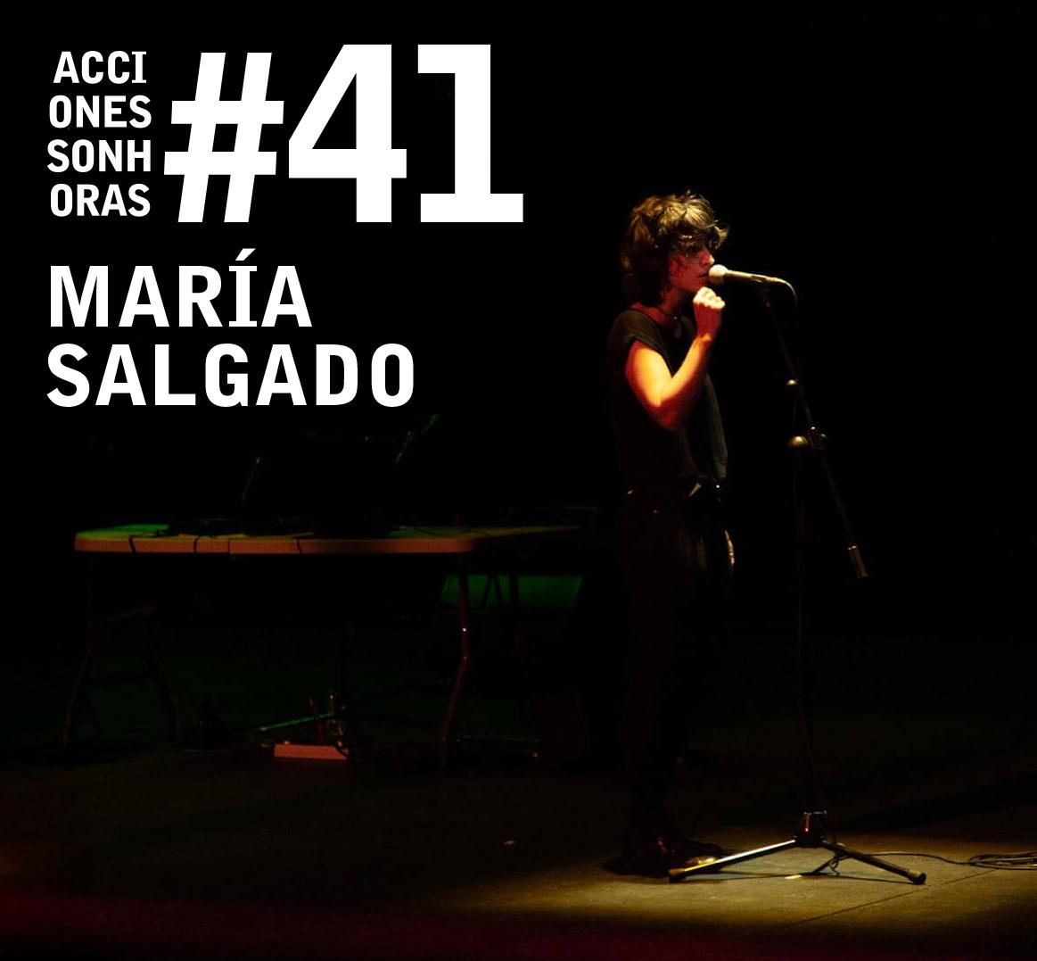 María Salgado (1984) és artista i poeta, combina l’escriptura i la performance en la recerca d’un so que reconnecti amb el món i el desig, amb el desig de món. Els seus últims llibres publicats són Orientada a Stein, REKORD i Salitre, així com l’assaig El Momento analírico. Ha presentat actuacions en solitari en museus com el MAC Montreal (De lengua Trois (three) pieces), WKV Stuttgart (Die 1, die eine 3 wurde), MACBA (Lírica/3) i el Museu Reina Sofía (Deja a ella probar), a més de tot tipus de centres culturals i espais autònoms d’Espanya, Estats Units, Mèxic, Perú, Argentina i Paraguai. Junt amb el compositor Fran MM Cabeza de Vaca, va crear la trilogia d’obres escèniques Jinete Último Reino, amb la qual van girar per nombrosos contextos com el 39 Festival de Tardor o l’auawirleben Teaterfestival. En conjunt amb la cineasta argentina Clarisa Navas, va rebre la XXIX Beca d’Arts Visuals Botín per realitzar la pel·lícula Vía Versus. És professora d’Història de l’Art a la facultat de Belles Arts de Cuenca (UCLM) i forma part del Seminari Euraca, un col·lectiu de pensament, lectura i escriptura sobre llengües i crisi amb seu a Madrid, ciutat on viu i crea.