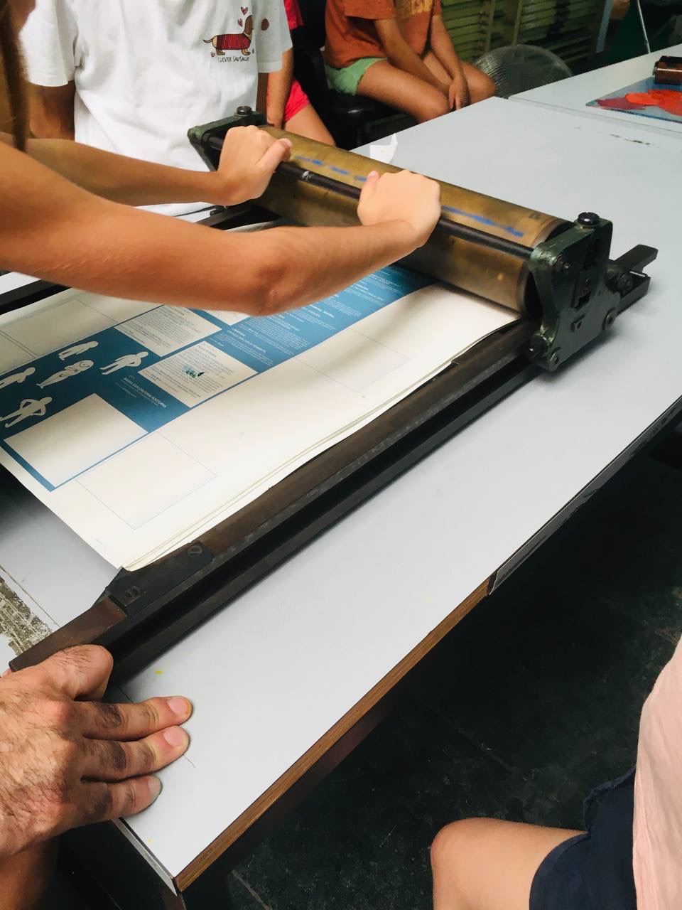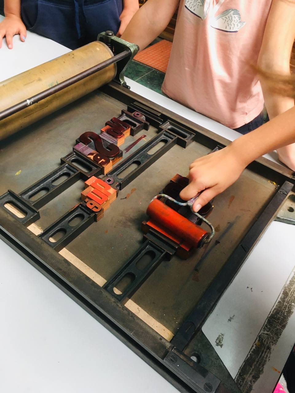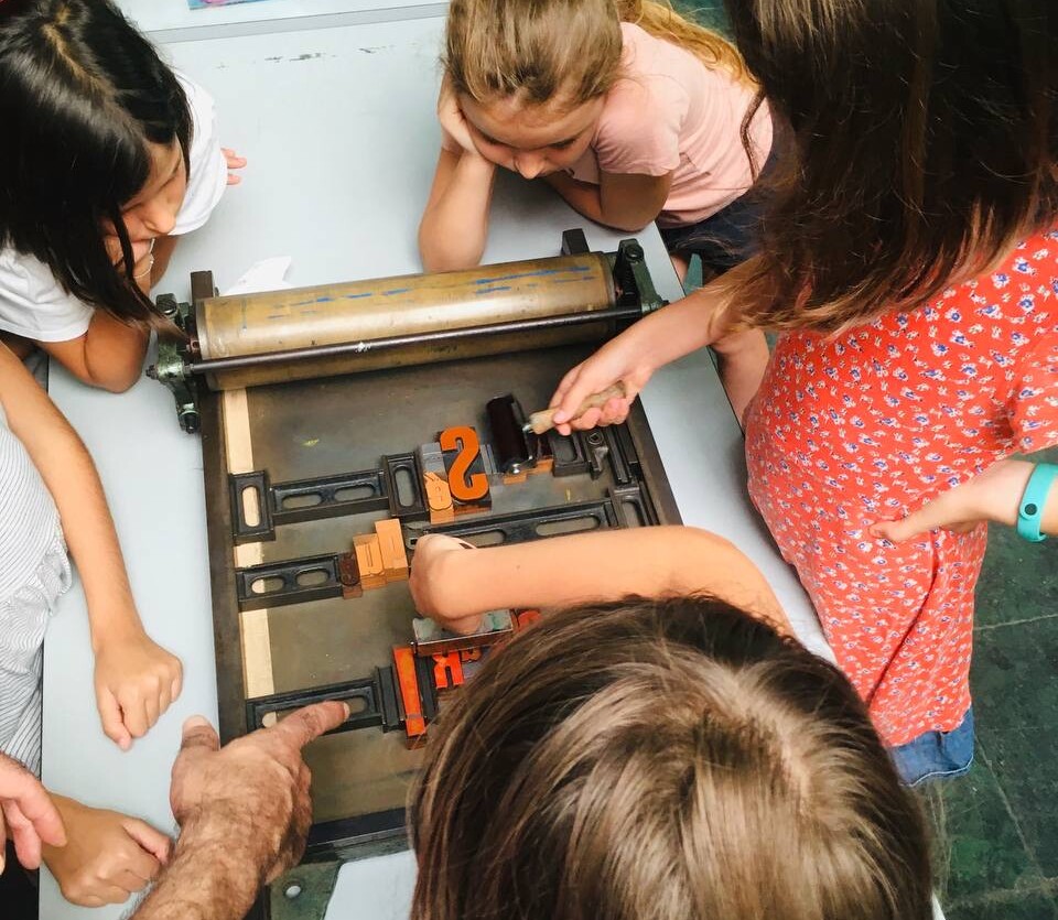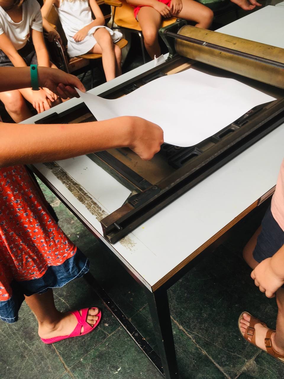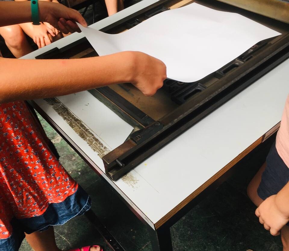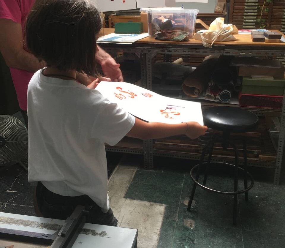 Taller con tórculo con los niños y niñas del casal de verano del Taller de les maquetes. Escribieron en una hoja sus frases, después las leyeron en voz alta, votamos y elegimos las que nos gustaban más. Estas frases seleccionadas las imprimieron en el tórculo ellos mismos, permitiendo que cada niña y niño hiciera el proceso de entintado e impresión.