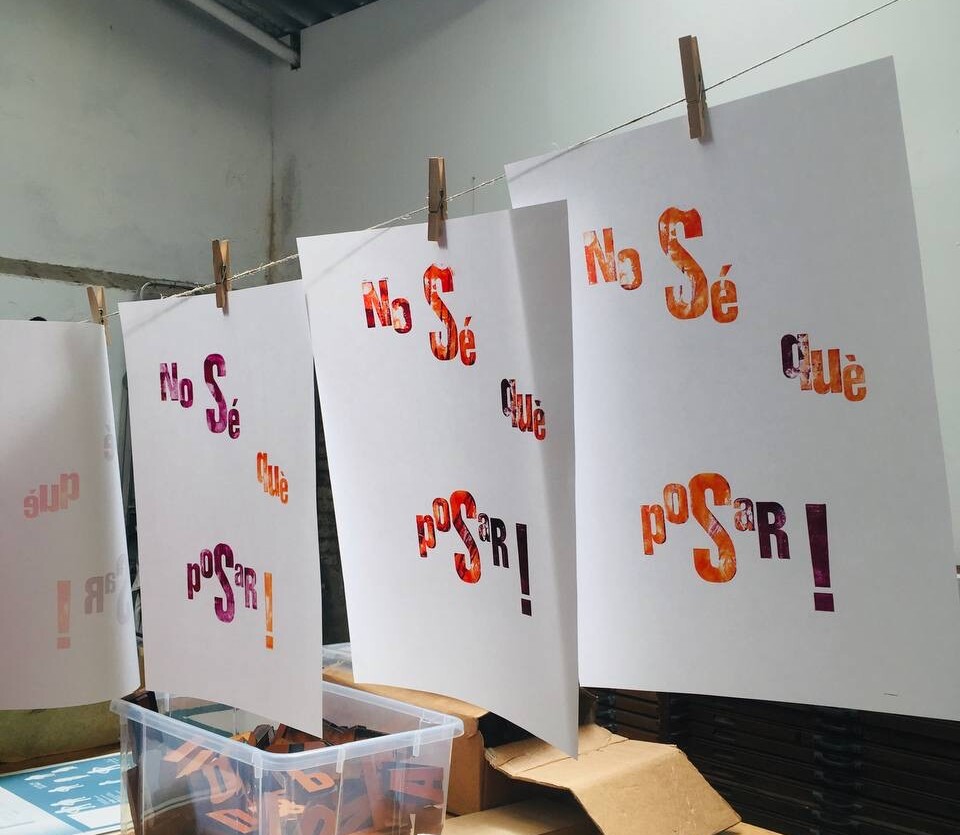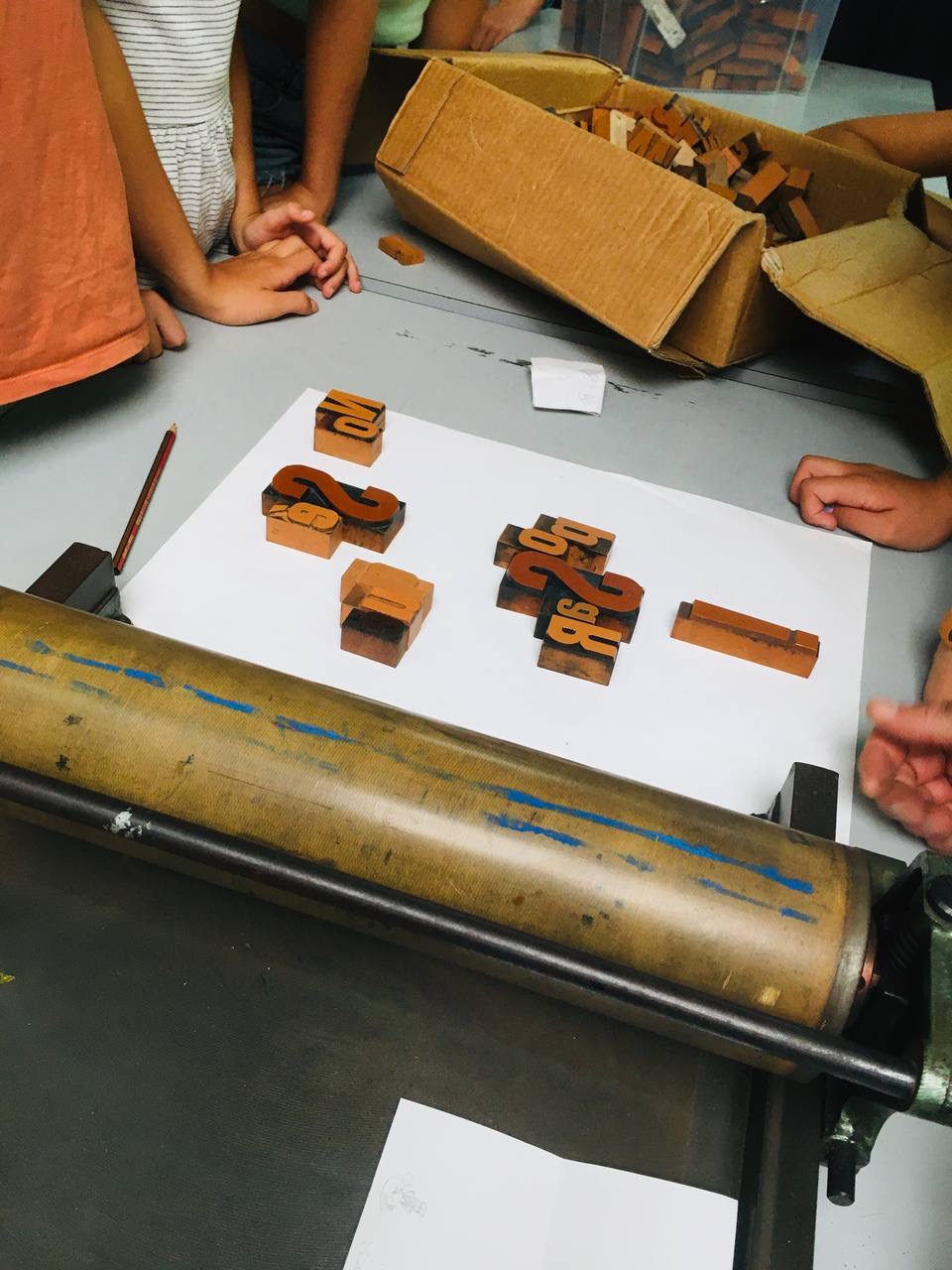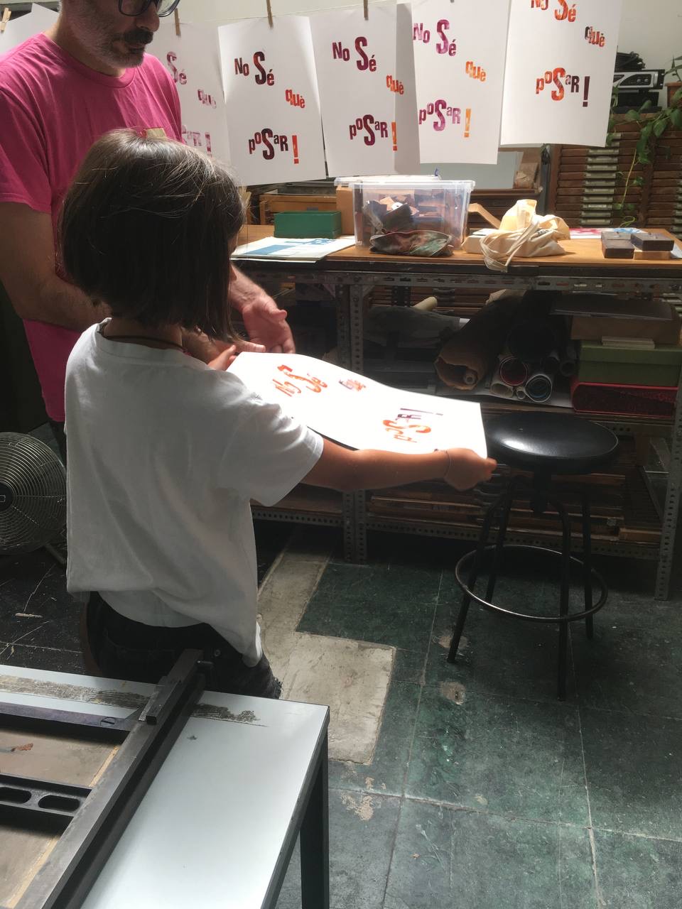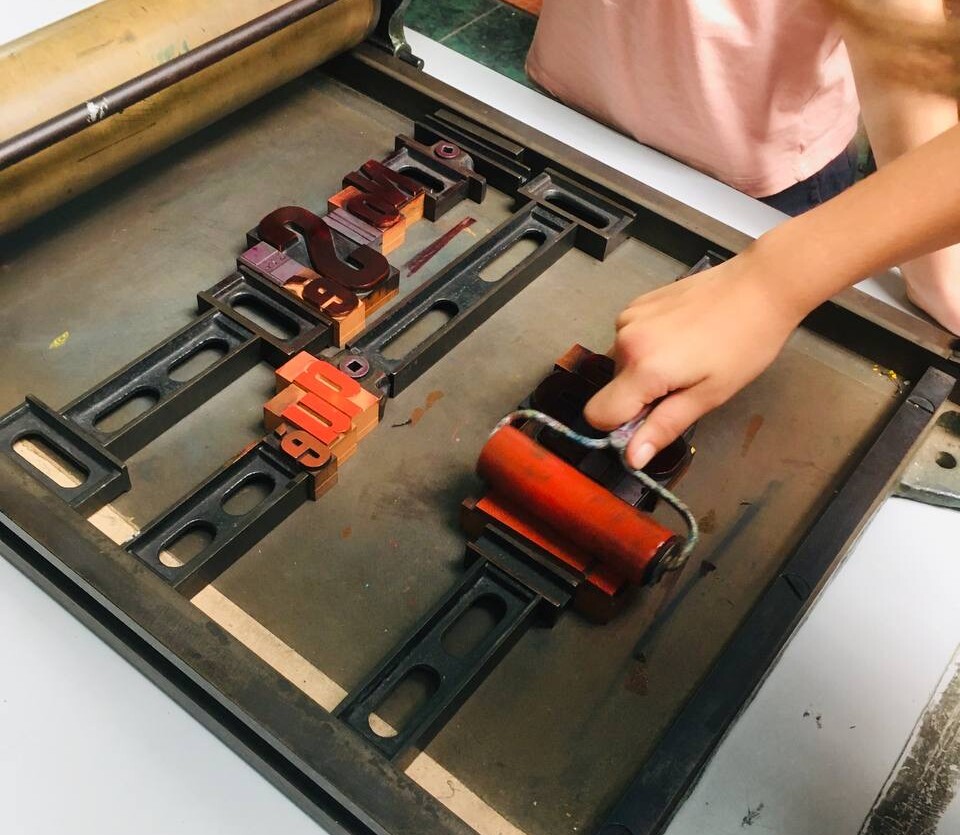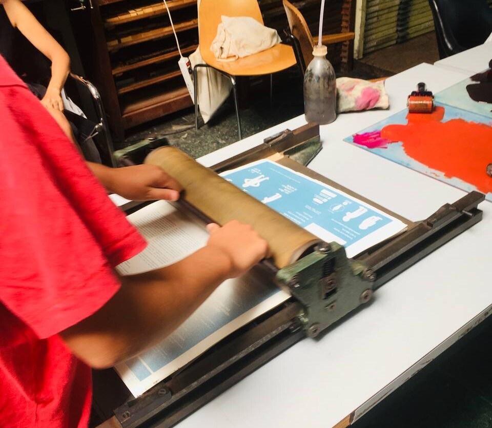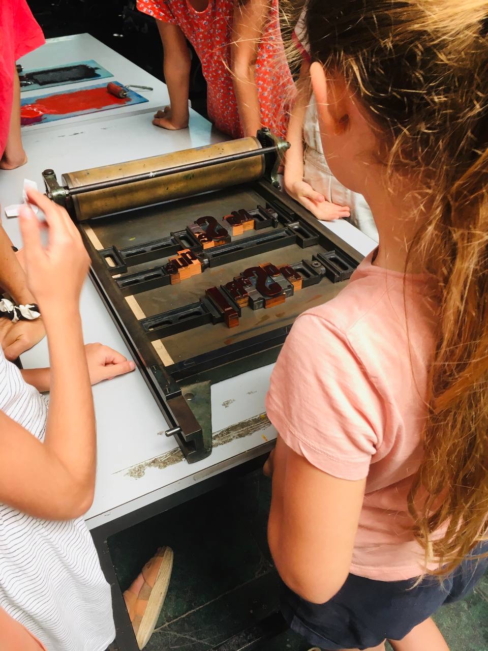 Taller con tórculo con los niños y niñas del casal de verano del Taller de les maquetes. Escribieron en una hoja sus frases, después las leyeron en voz alta, votamos y elegimos las que nos gustaban más. Estas frases seleccionadas las imprimieron en el tórculo ellos mismos, permitiendo que cada niña y niño hiciera el proceso de entintado e impresión.