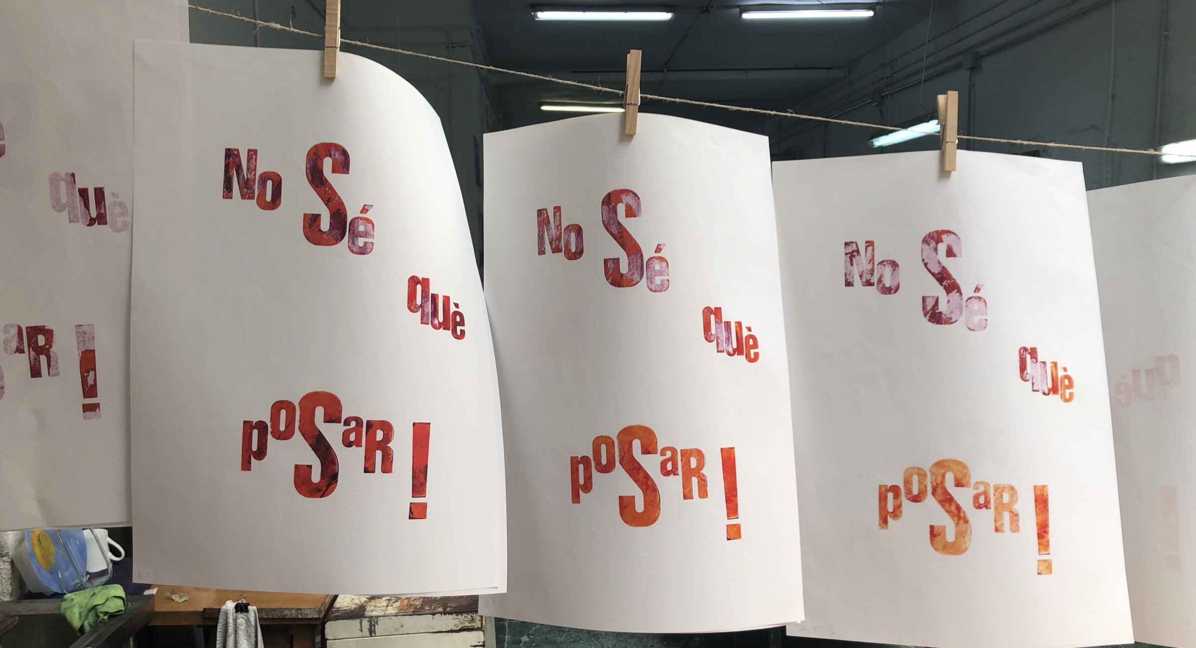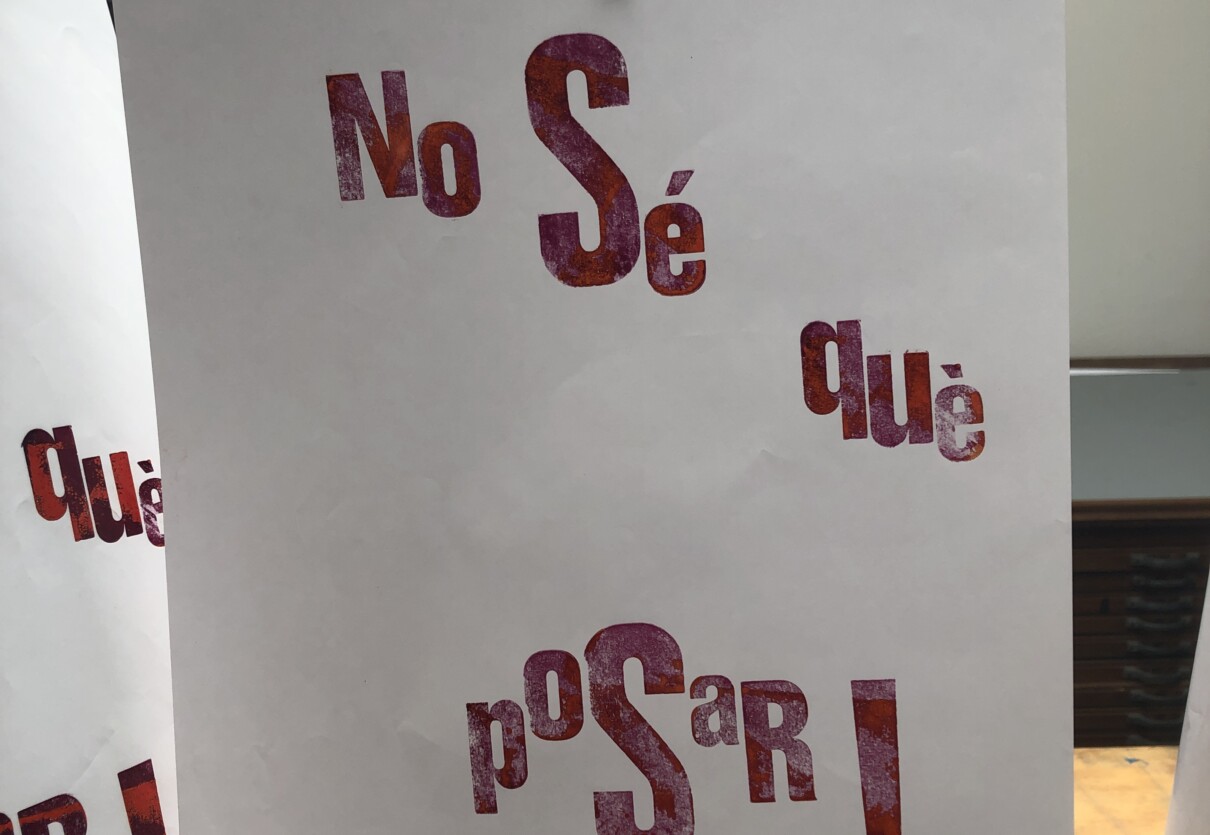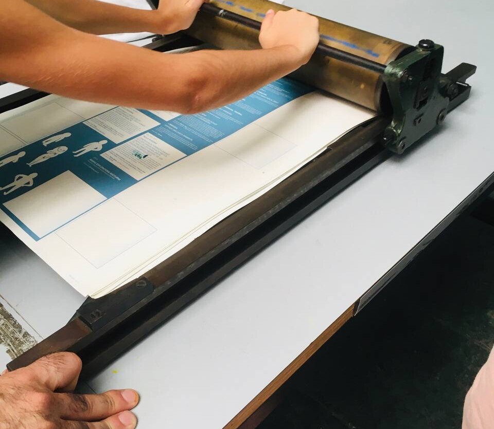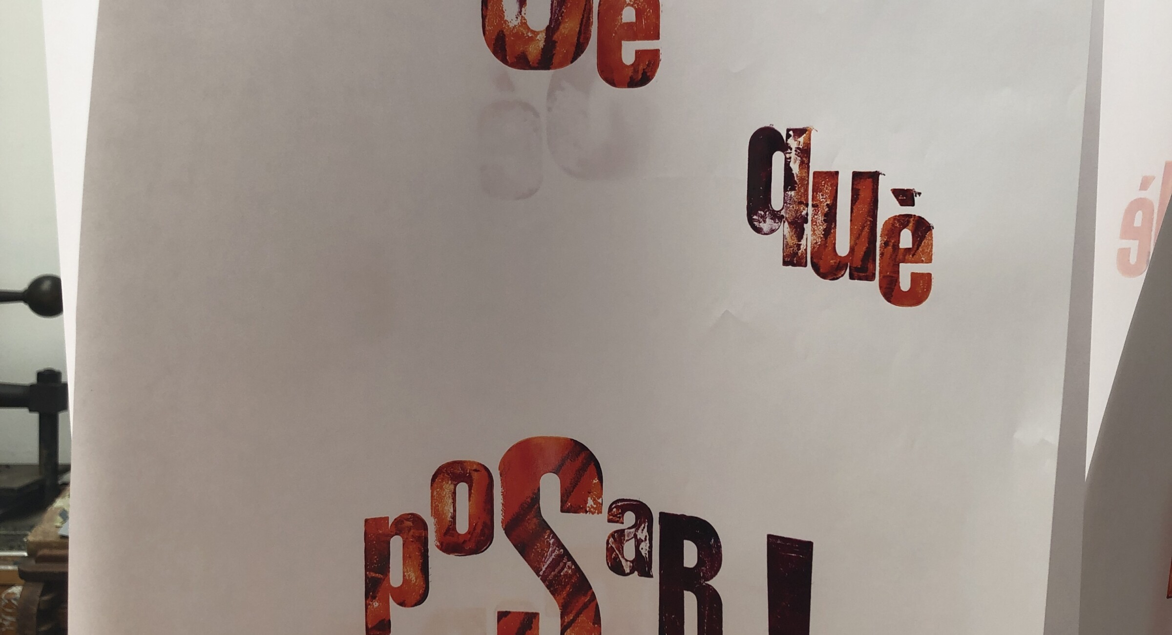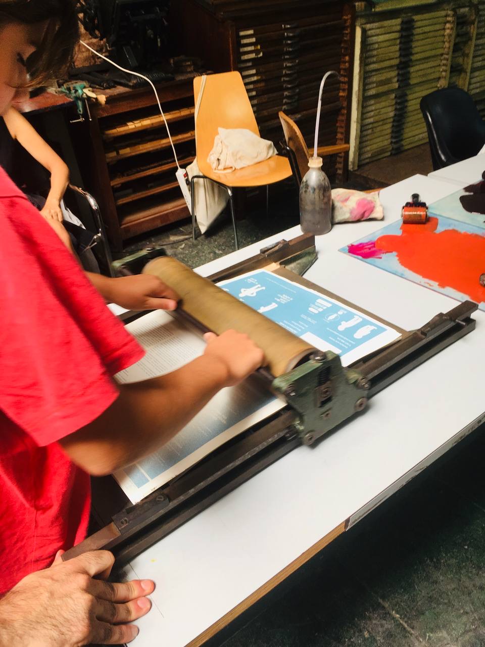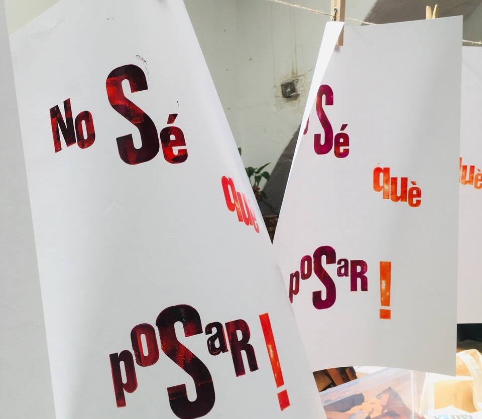 Taller con tórculo con los niños y niñas del casal de verano del Taller de les maquetes. Escribieron en una hoja sus frases, después las leyeron en voz alta, votamos y elegimos las que nos gustaban más. Estas frases seleccionadas las imprimieron en el tórculo ellos mismos, permitiendo que cada niña y niño hiciera el proceso de entintado e impresión.