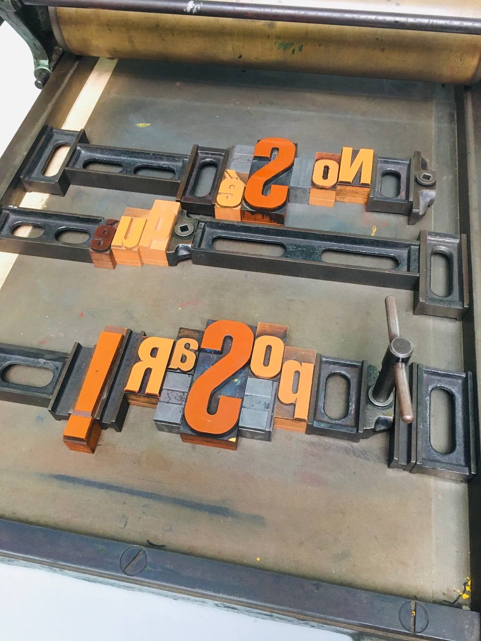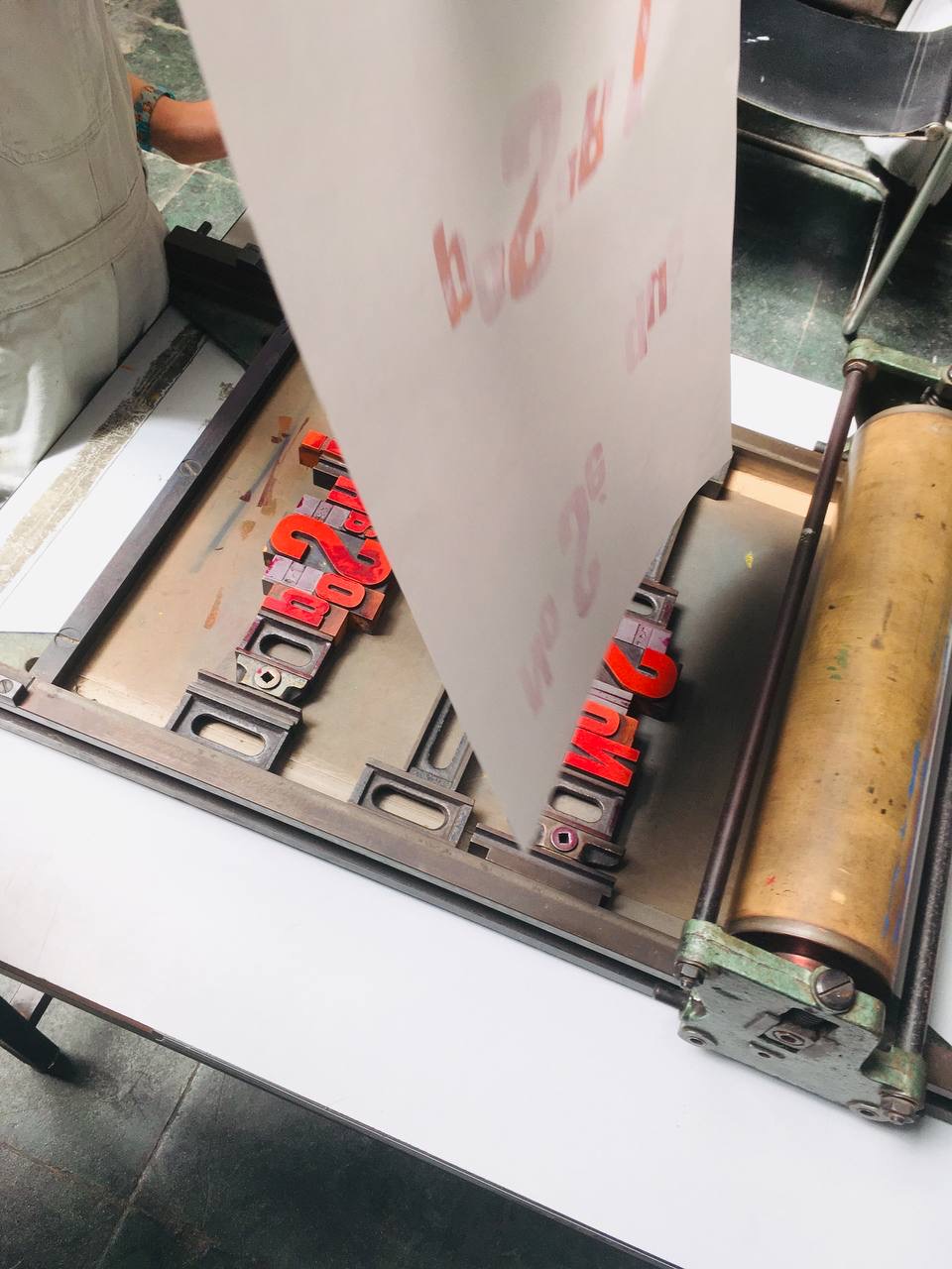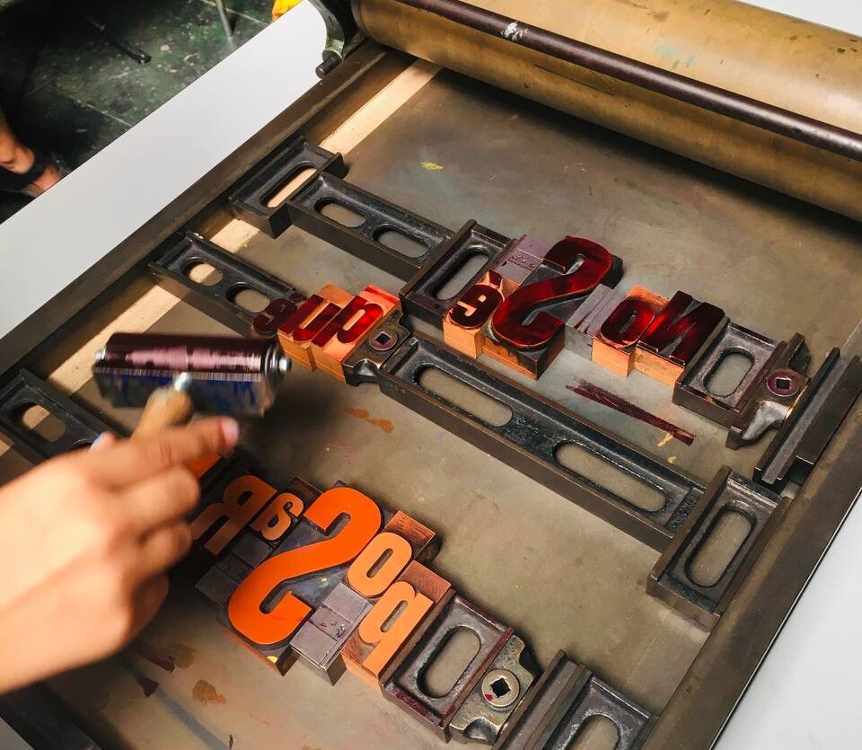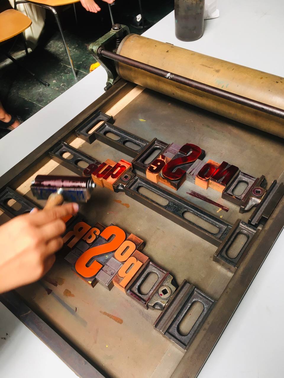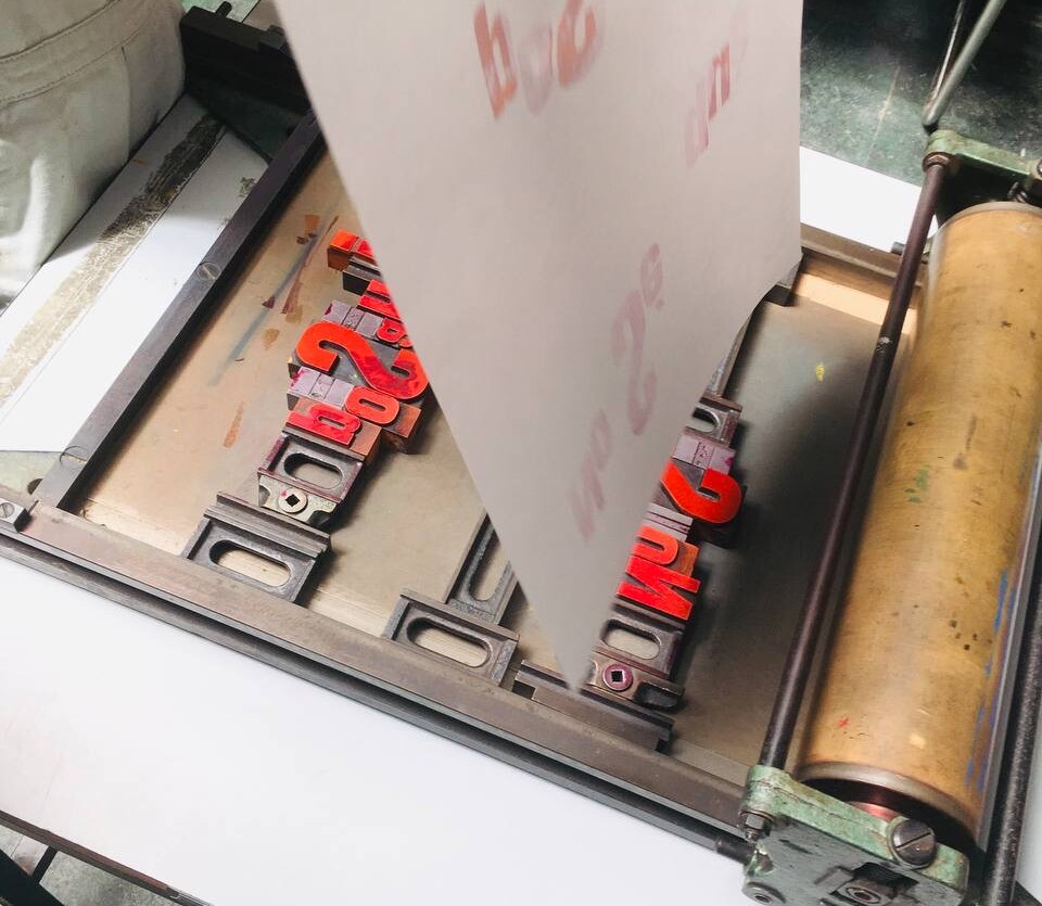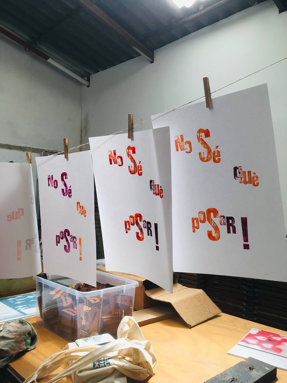 Taller con tórculo con los niños y niñas del casal de verano del Taller de les maquetes. Escribieron en una hoja sus frases, después las leyeron en voz alta, votamos y elegimos las que nos gustaban más. Estas frases seleccionadas las imprimieron en el tórculo ellos mismos, permitiendo que cada niña y niño hiciera el proceso de entintado e impresión.