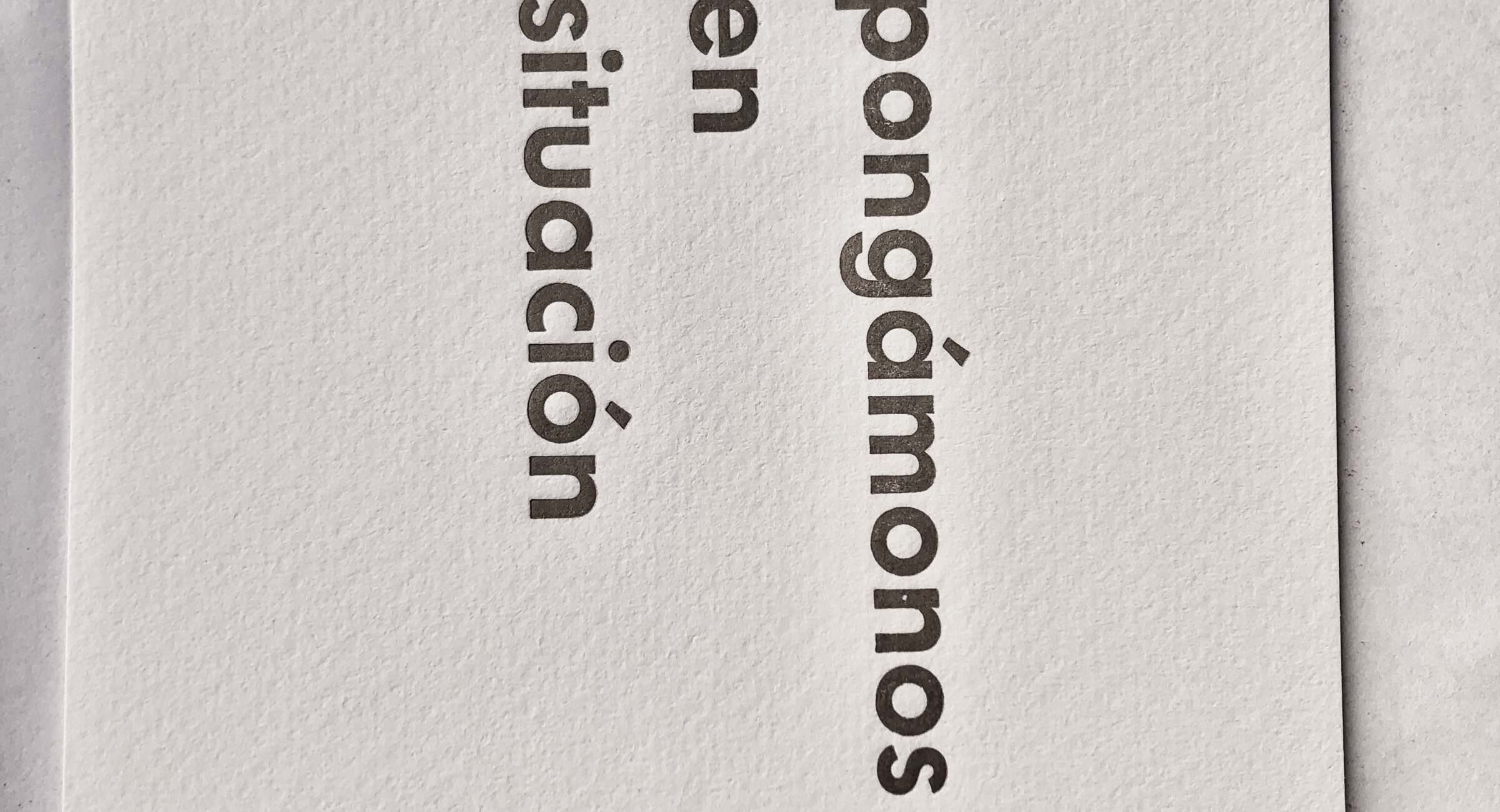 Con las alumnas de la Escuela de Medios Audiovisuales (EMAV) hicimos una lluvia de ideas donde cada una escribió una frase, que después leímos en voz alta seleccionando la frase que más les gustaba para imprimirla. La frase elegida fue «Pongámonos en situación», que se imprimió en papel adhesivo, con la idea de poder pegarla por todas partes en cualquier «situación» posible.