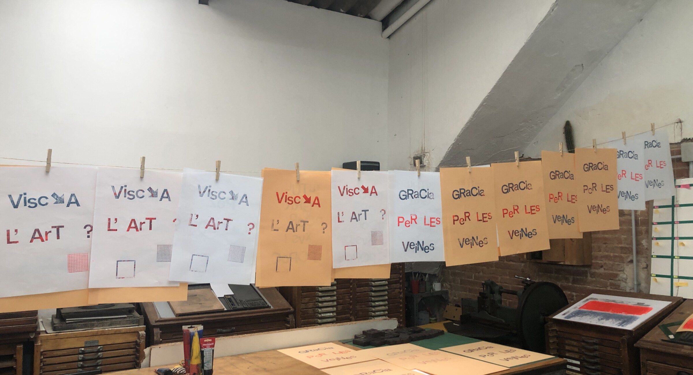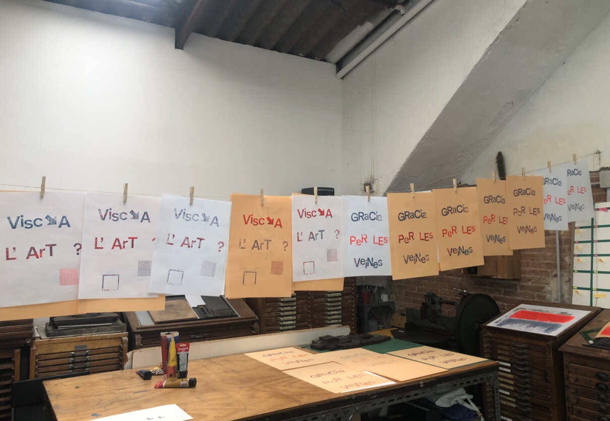 Taller amb tòrcul per al casal d’estiu d’EART on prèviament havien estat treballant els continguts, sota el lema “La imaginació és una història pròpia”. Les frases seleccionades les van imprimir al tòrcul ells mateixos, permetent que cada nen i nena fes el procés d’entitat i d’impressió. Els cartells resultants es van penjar posteriorment arreu del barri i d’EART.
