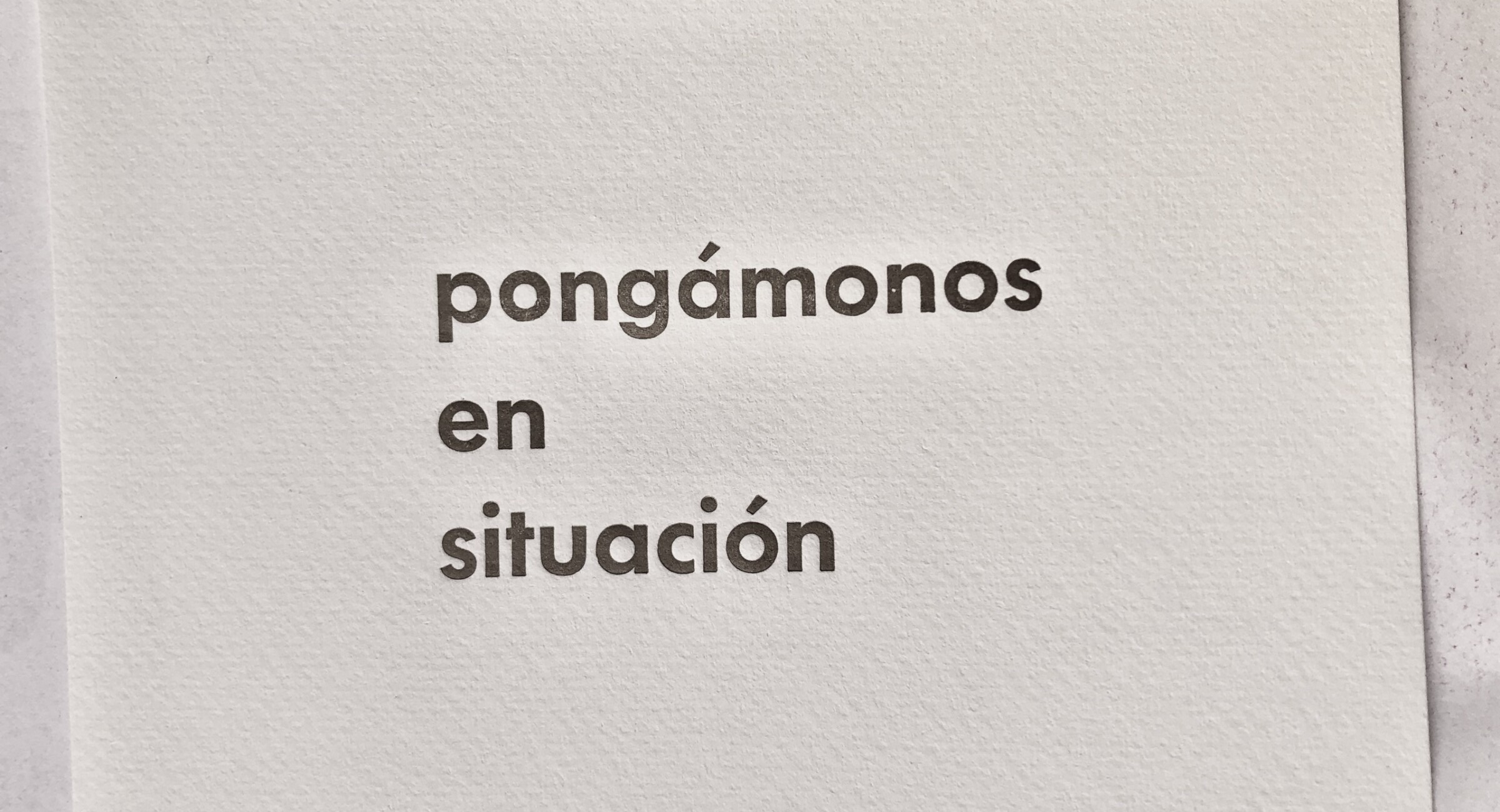 Amb els alumnes de l’Escola de Mitjans Audiovisuals (EMAV) vam fer una pluja d’idees on cadascú va escriure una frase, que després vam llegir en veu alta seleccionant aquella frase que els agradava més per impirmir-la. La frase triada va ser «Pongámonos en situación», que es va imprimir amb paper adhesiu, amb la idea de poder «posar-la» arreu en qualsevol «situació» possible.